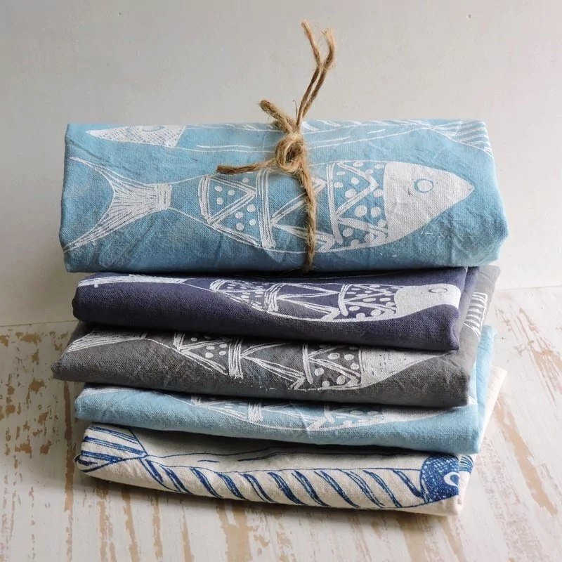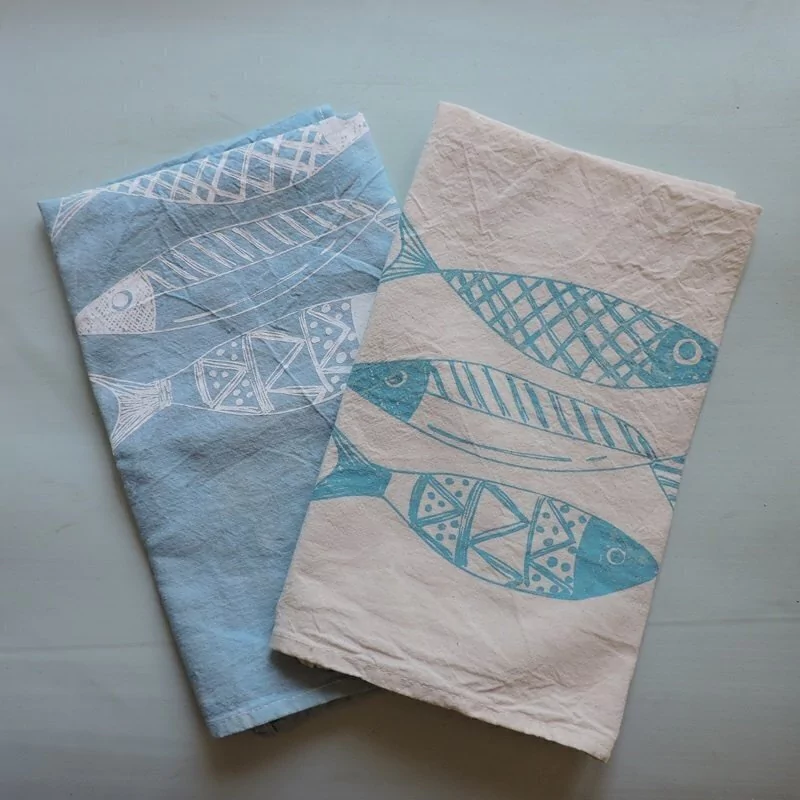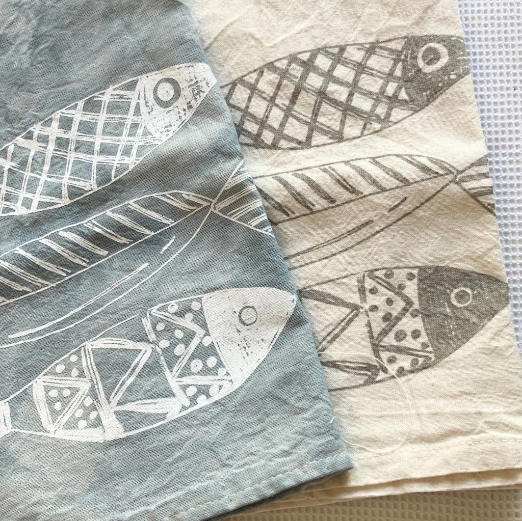 Pack de dos repasadores en composé con motivos de peces, uno en color natural y el otro teñido con anilinas, combinando colores y estampas.